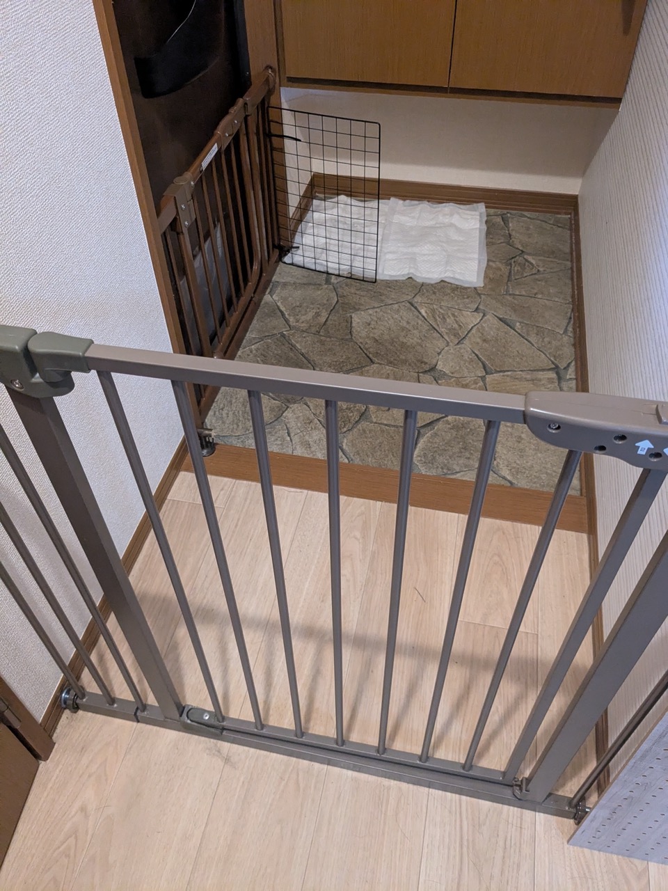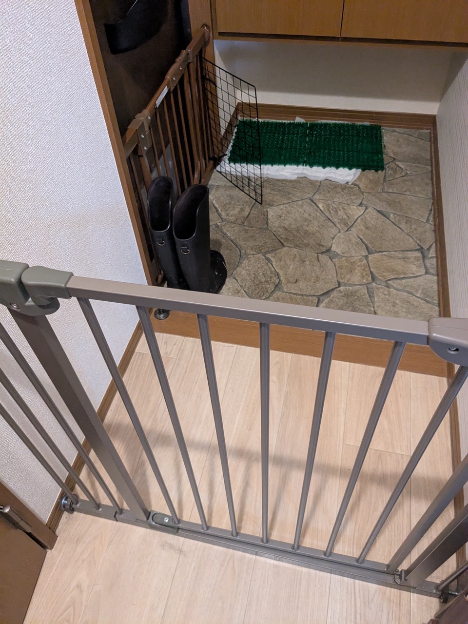 自分の生活エリアでは絶対しないという習性を利用します。廊下にゲートを設置し、玄関までいけないようにしました。