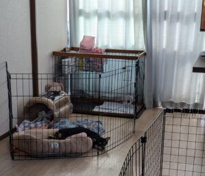 ちなみに1キロくらいの子犬だと、ゲートの柵の間を通れてしまうので、ワイヤーネットをゲートの扉に張るなどするといいと思います。
